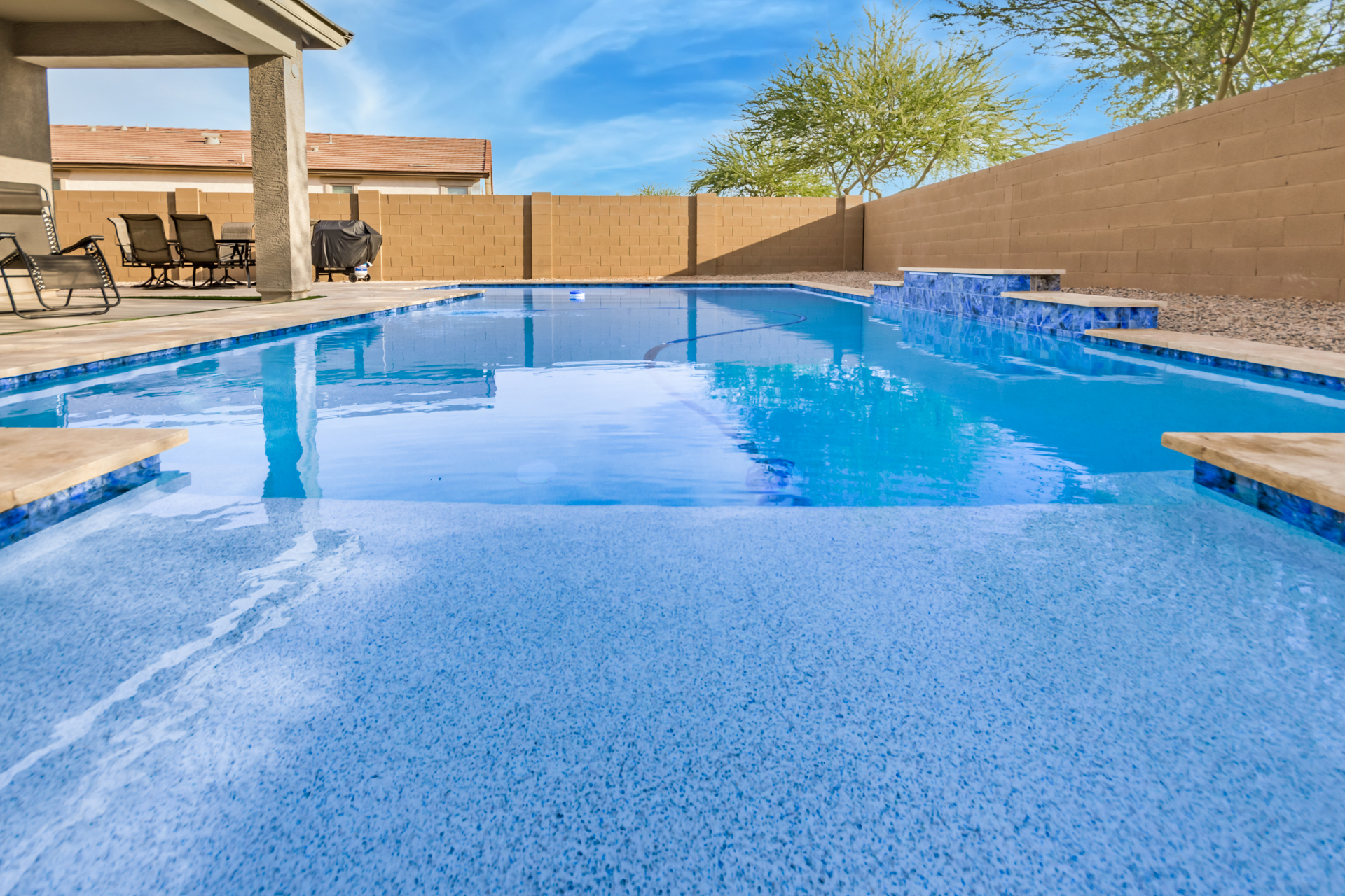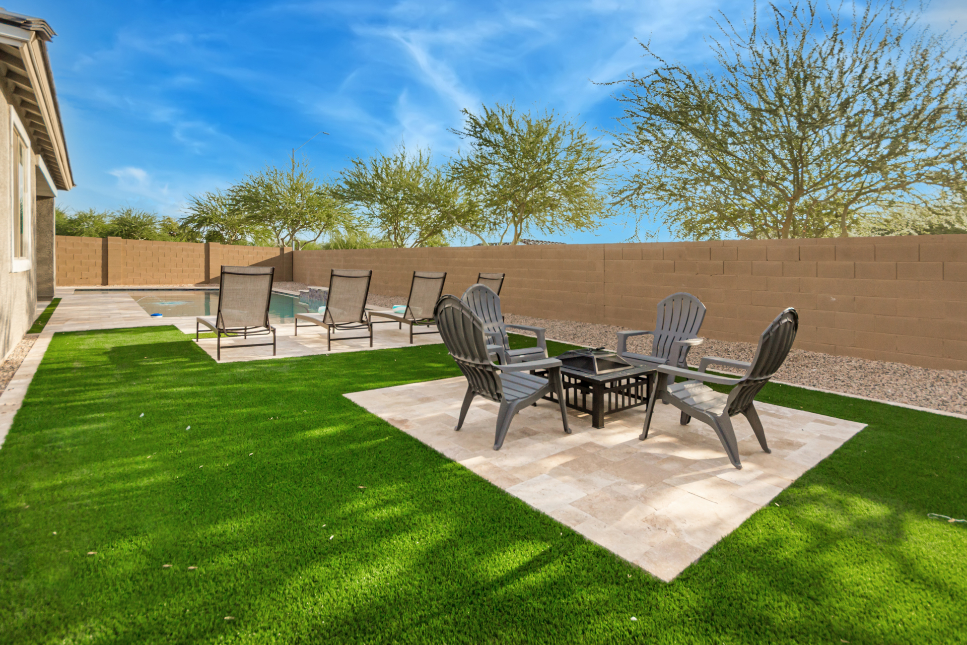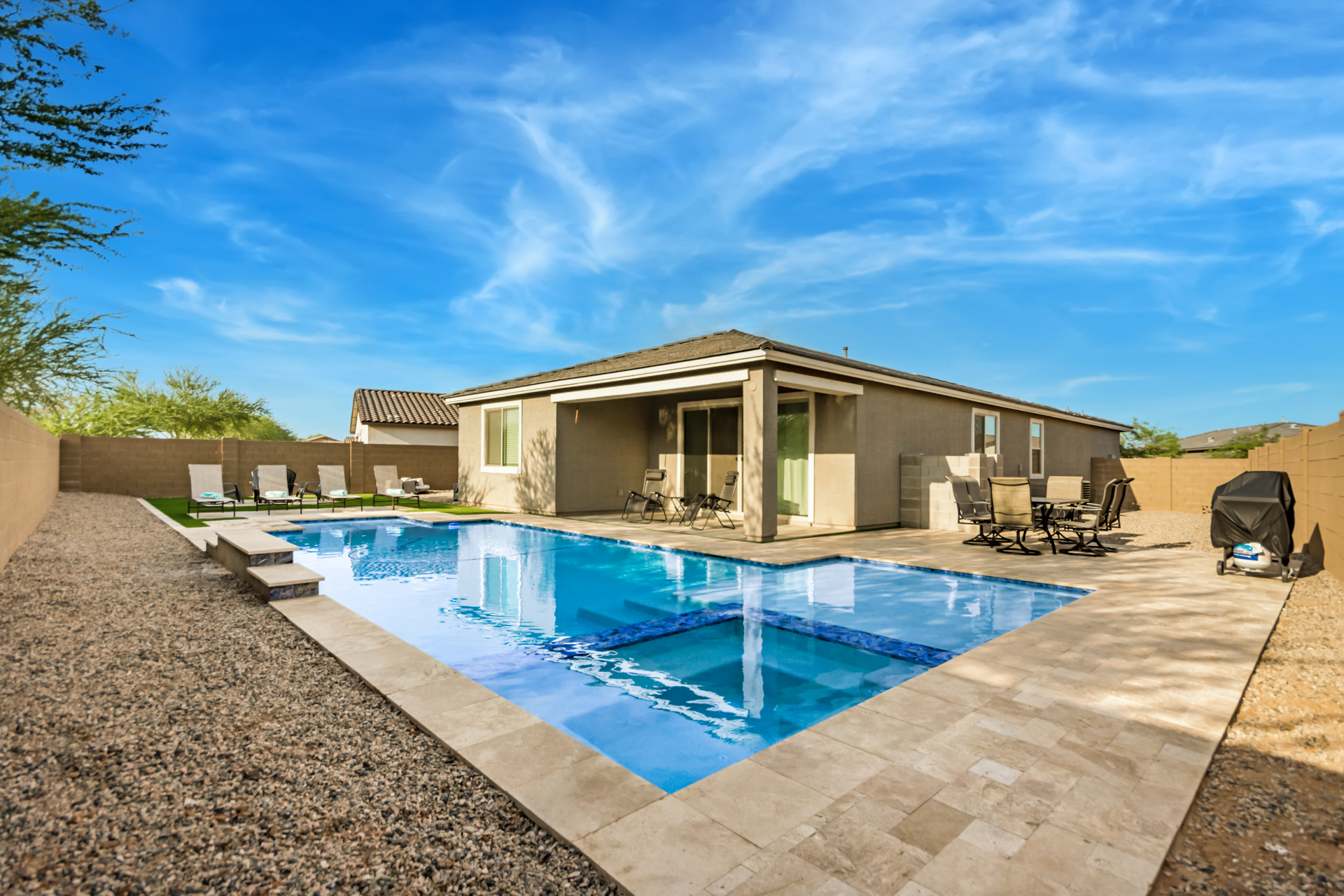 Step outside to a fencedheated pool, and a clean turf backyard with a dedicated seating area. Perfect for unwinding in the Arizona air.