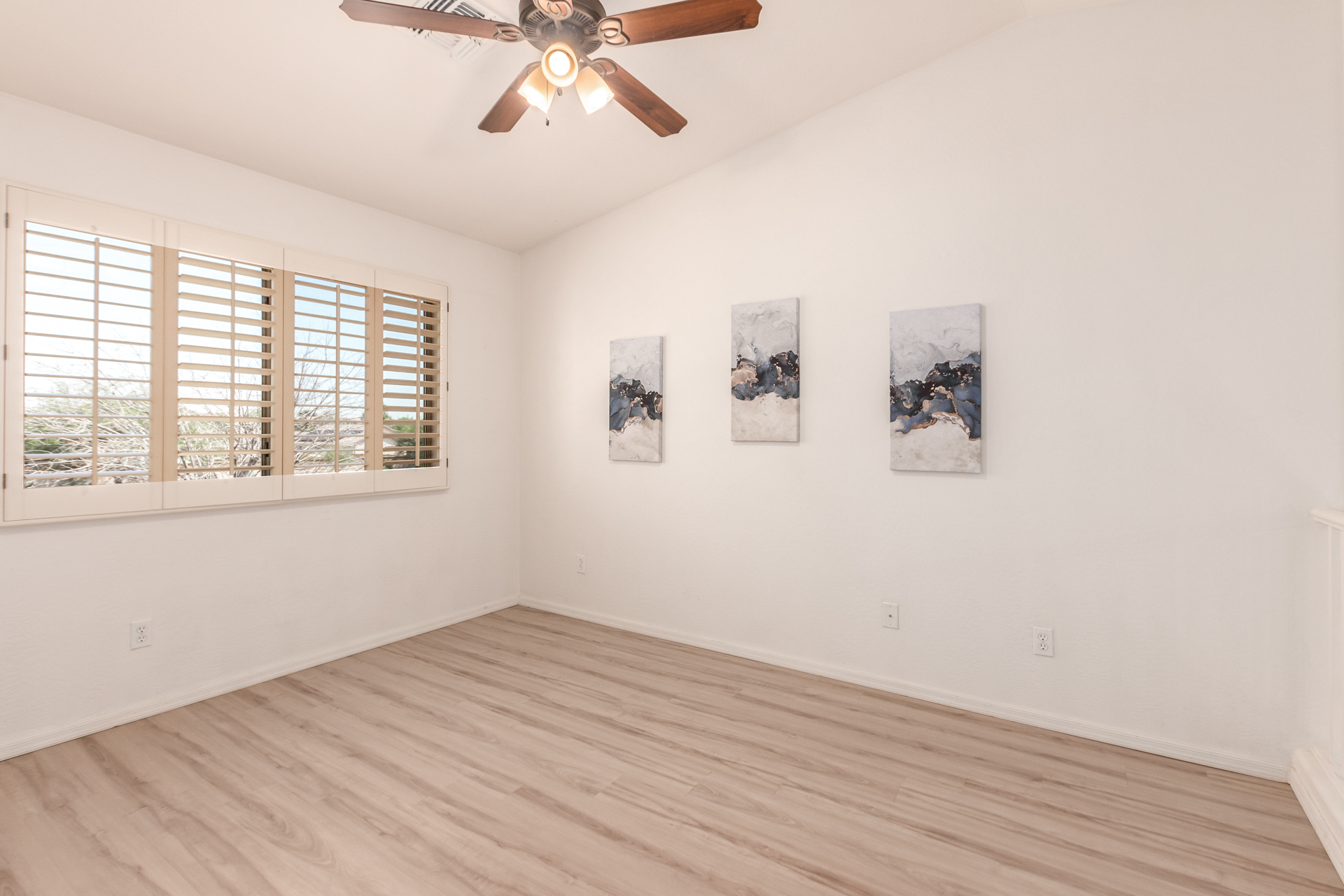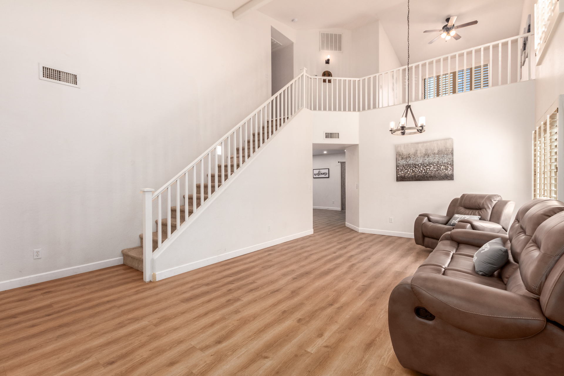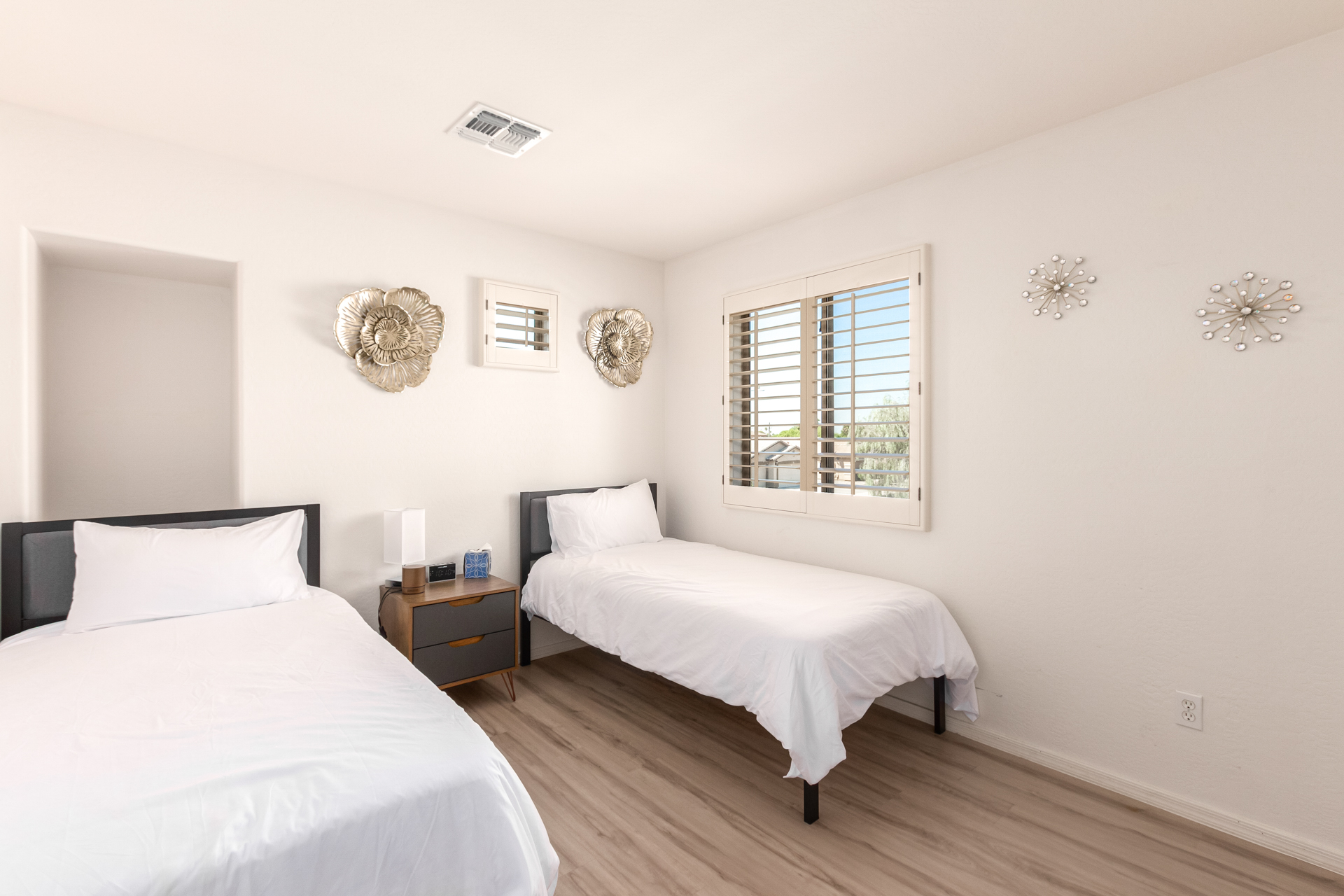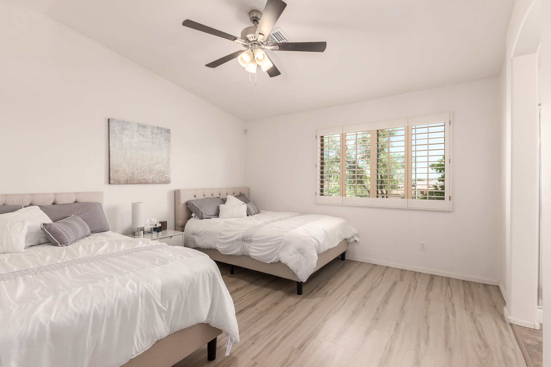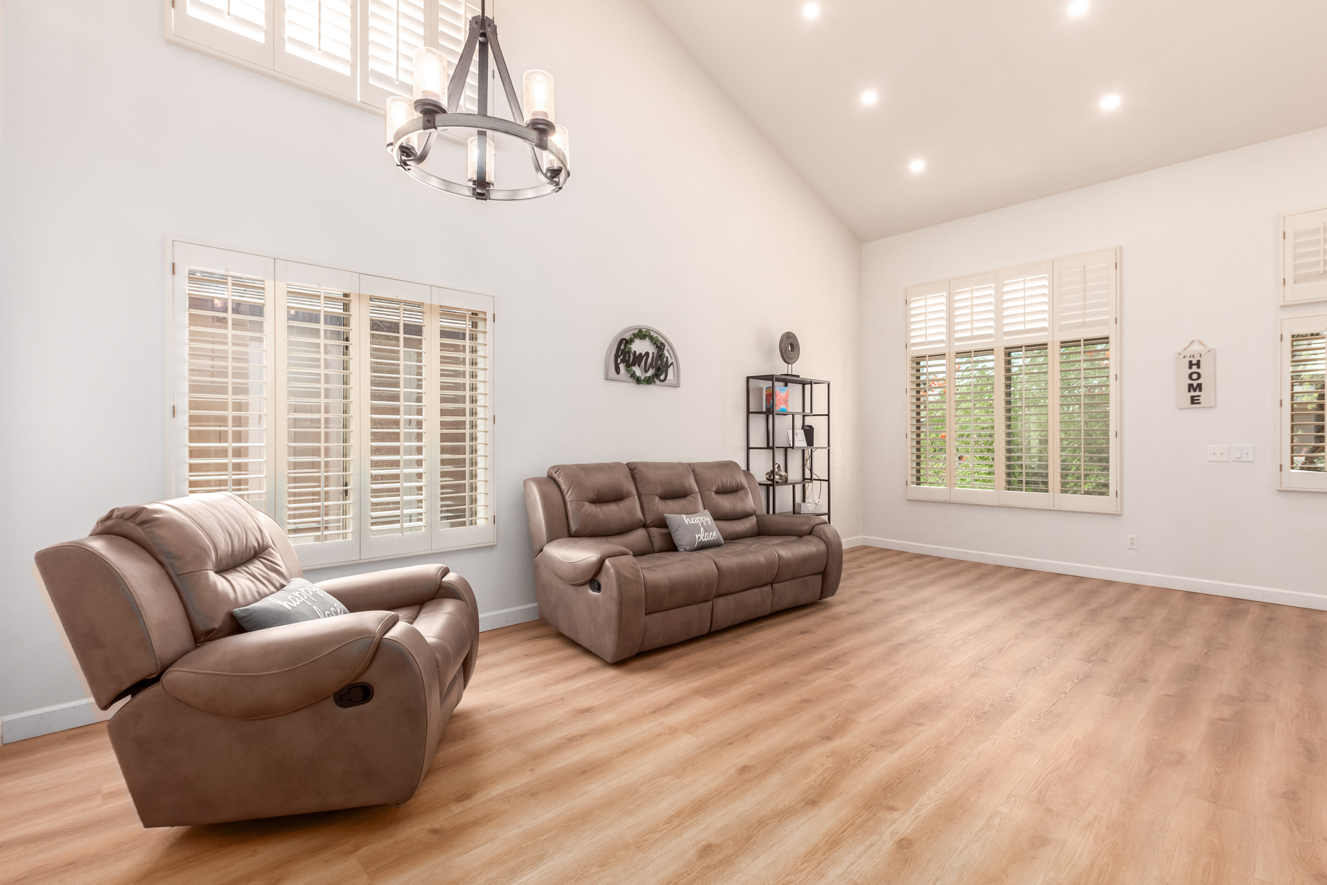 The lovely mix of desert greenery in the front yard sets the tone for this home’s charm. Inside, a spacious entryway, vaulted ceilings, and tall windows create an open, airy feel. The home includes well-appointed bedrooms, a cozy living area, and a kosher kitchen with a tiled backsplash. The private backyard is thoughtfully designed, featuring mature trees, a covered flagstone patio, and a peaceful outdoor atmosphere ideal for relaxing with family or guests.
